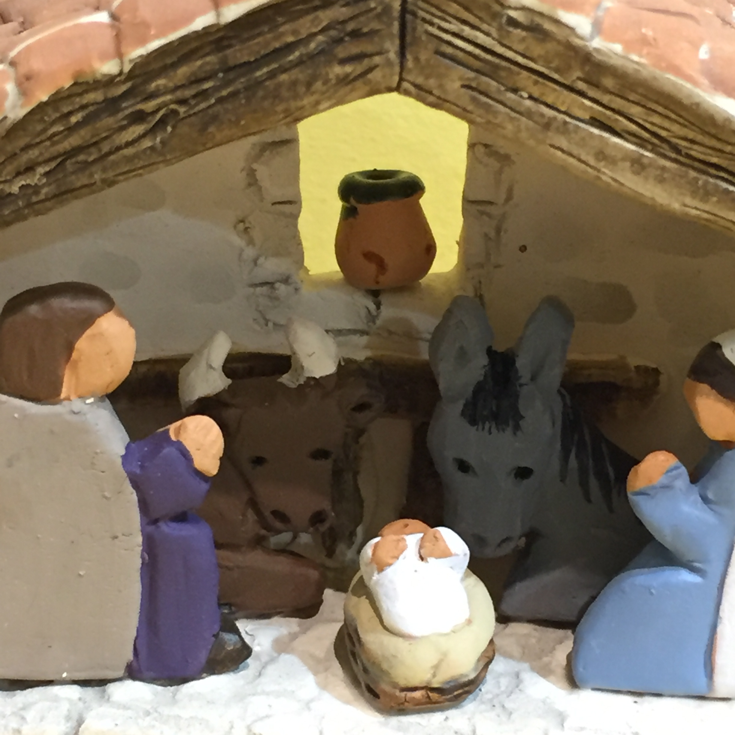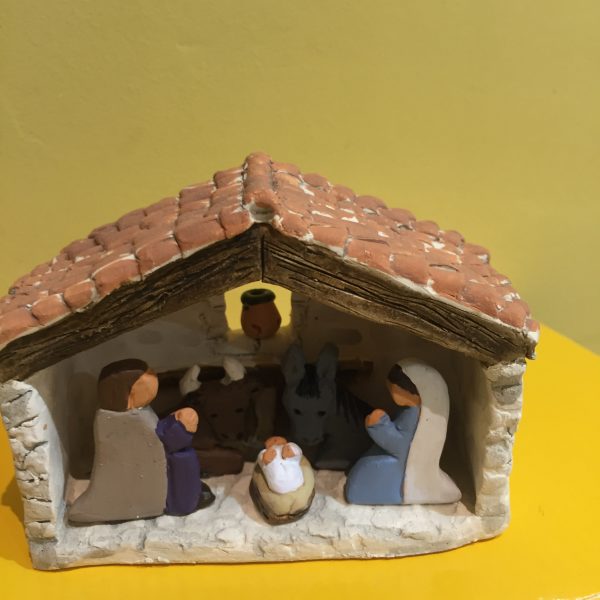 Crèche de Provence miniature, dimensions 9 x 7 x 4 cm, santons en terre cuite de 3 cm, entièrement modelée et fabriquée dans les Alpes Maritimes, France. Pièce unique, images non contractuelles