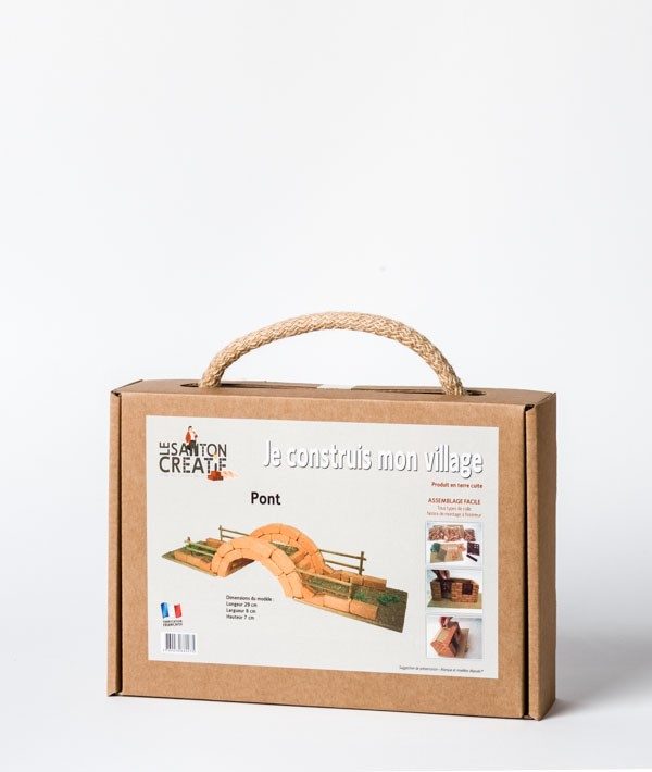 Jeu de construction en terre cuite comprenant 1 sachet de briques, 1 sachet de briques arrondies, 1 sachet de petites pièces, 1 sachet de terre / mousse, 2 socles, 1 planchette, bâtonnets. Dimensions modèle monté (cm) : 35 x 9 x 6.5. Fabriqué en Provence, France