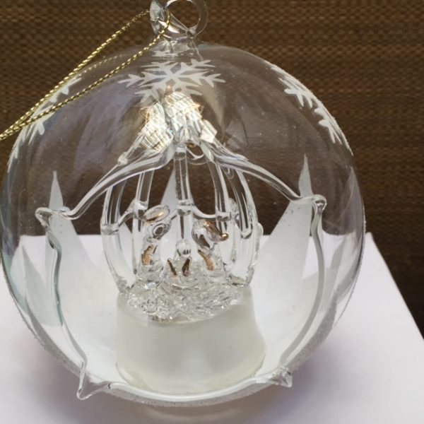 Grosse boule en verre fin avec nativité lumineuse grâce à une pile intégrée.