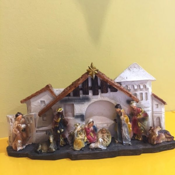Crèche en résine décoré main, dimension 14 x 7 x 3cm. Ensemble très réussi et peu encombrant !