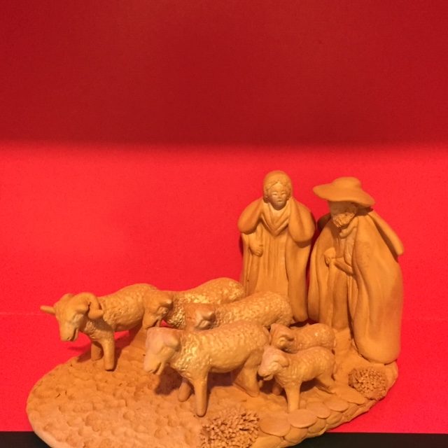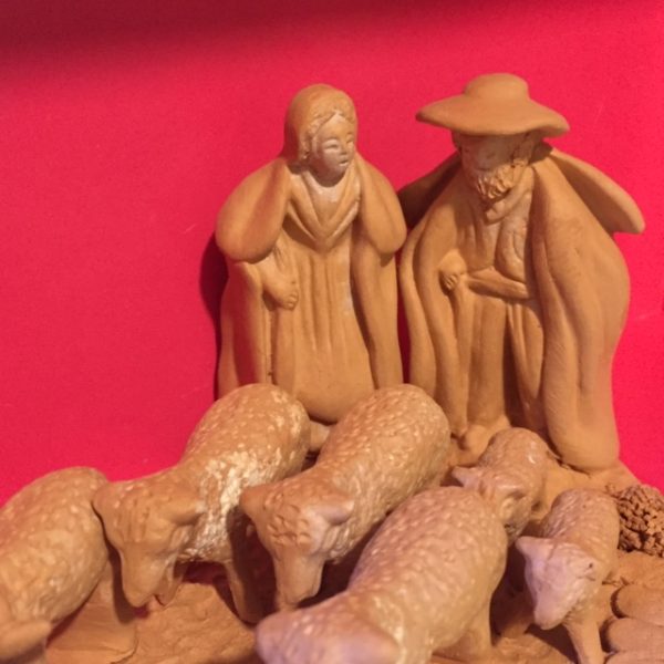 Scène composée de santons 1 homme et 1 femme, 1 bélier, 3 moutons, 2 agneaux (7 cm), brut en terre cuite, fabriqué en Provence, France. Composition disponible peinte : 60 €.